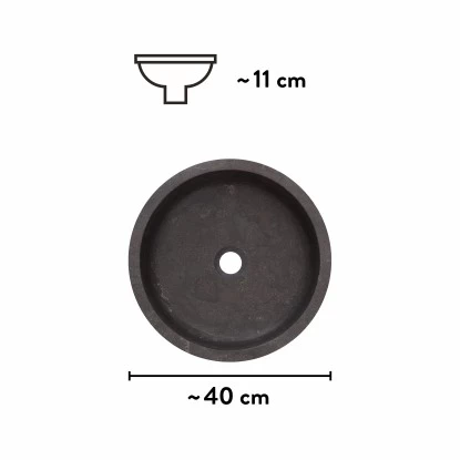 Durch die kompakten Maße mit 40 cm Ø und einer Höhe von 11 cm kannst du das Aufsatzwaschbecken gut auch in kleinen Bädern und Gäste-WC´s anbringen. Montieren kannst du dein Waschbecken auf stabilen Platten, Waschtischen oder Unterschränken in passender Größe. Das massive Becken wurde ohne Hahnloch und Überlauf gefertigt. So entsteht eine Optik „wie aus einem Guss“. Du kannst es mit einer Wandarmatur oder einer Armatur mit hohem Auslauf, die neben dem Waschtisch montiert wird, ergänzen. Besonders wichtig: Waschbecken ohne Überlauf solltest du nur mit nicht verschließbaren Ventilen verwenden. So kann das Wasser nicht versehentlich übertreten.