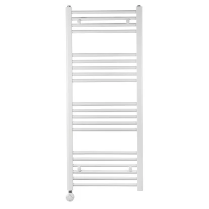 Der Handtuchheizkörper ist klassisch in Weiß gehalten. Sein zeitlos elegantes Design passt zu jedem Einrichtungsstil. Er verfügt über 20 Querstreben, an denen Sie mehrere Handtücher platzieren und vorwärmen bzw. trocknen können. Dank seiner flachen Bauweise und den Maßen von 120 cm x 50 cm (H x B) kann der Badheizkörper auch in engen oder kleinen Räumen angebracht werden. Er verfügt über einen Heizstab mit einer Leistung von 600 W für eine gleichmäßige Wärmeverteilung und ist insbesondere für die Nutzung in Feuchträumen geeignet.