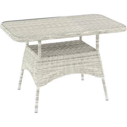 Der Tisch verfügt über eine angenehme Höhe zum Abstellen von Getränken und Snacks und ist mit einer pflegeleichten Glasplatte ausgestattet. Diese vermittelt nicht nur eine edle Optik, sondern lässt sich auch leicht reinigen. Unter der Tischplatte befindet sich eine praktische Ablagefläche, die beipielsweise Platz für Tischwäsche oder Untersetzer bietet.