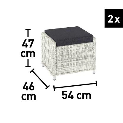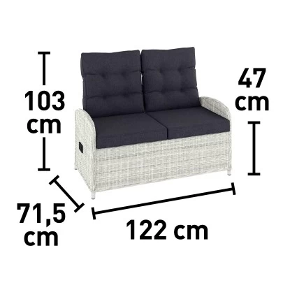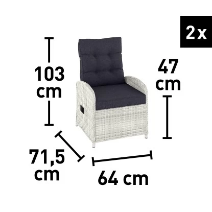 Die Möbelstücke sind in ansprechender Flechtoptik gehalten. Das Wicker-Geflecht in der Farbe Eisgrau ist witterungsbeständig und langlebig. Durch das robuste Rattangestell wird die Konstruktion besonders stabil. Bequeme und farblich abgestimmte Sitz- und Rückenkissen sind gleich mitenthalten. Die Bezüge bestehen zu 100 % aus Polyester, das Futter zu 100 % aus Polypropylen. Die Füllung ist aus Polyester gefertigt, während die Sitzkissen über eine Schaumstoffpolsterung aus Polyurethan verfügen.
