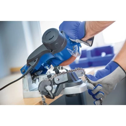 Das LUX-TOOLS Sägekettenschärfgerät KSS-85 unterstützt Sie dabei, die Ketten Ihrer Kettensäge optimal zu schärfen. Der Vorteil dieses Gerätes liegt darin, dass die Bauweise so gestaltet ist, dass Sie die Kette jeweils ein Kettenglied weiter ziehen können und dieses immer in der optimalen Bearbeitungsposition einrastet. Das erspart ein zusätzliches Justieren und das Schärfergebnis ist entsprechend genau. Natürlich besitzt das Gerät eine drehbare Spannvorrichtung, eine Tiefenbegrenzung und einen schwenkbaren Schleifkopf.